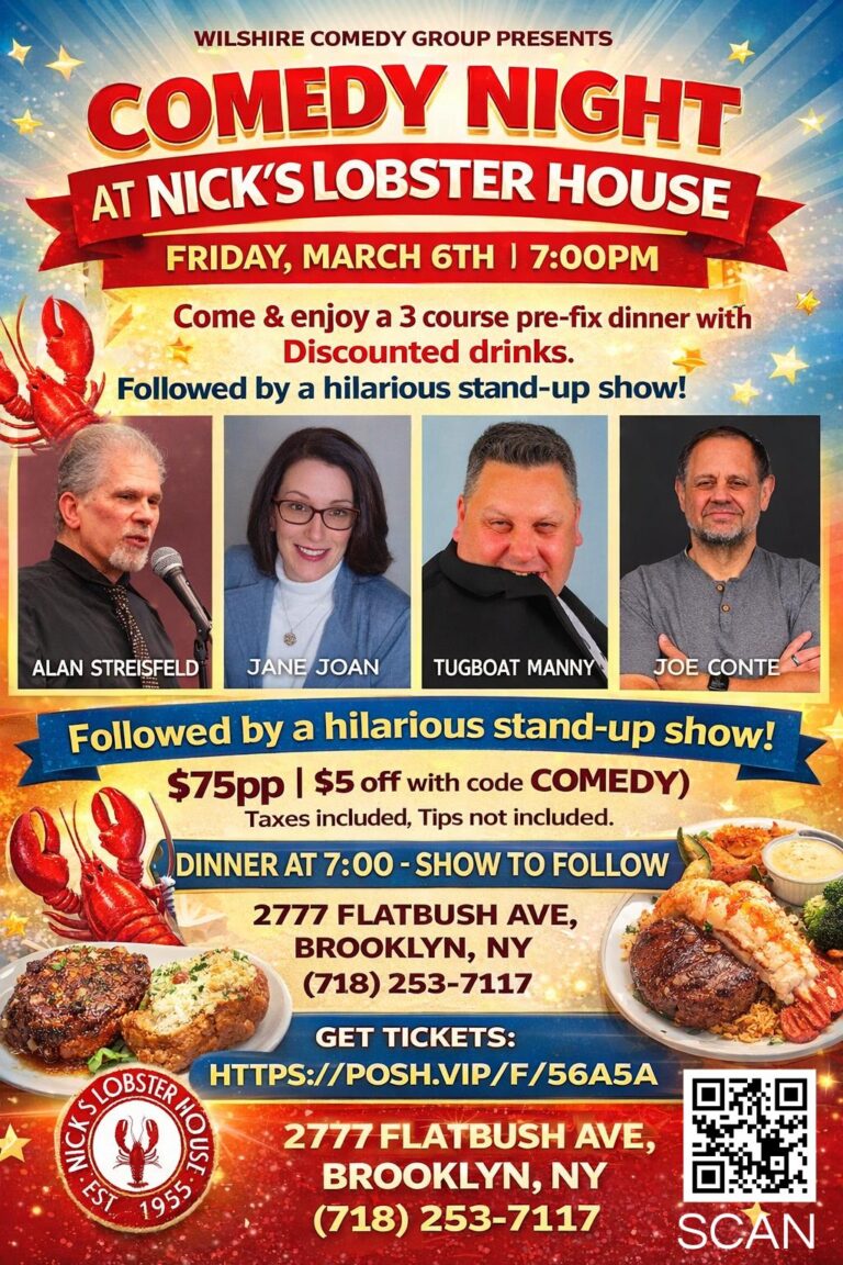 READ MOREFavorite0Friday March 6th 7pm 3 course pre-fix dinner followed by a stand-up comedy show with Alan Streisfeld, Jane Joan, Tugboat Manny, Joe Conte. $75pp (when using the $5 off code
