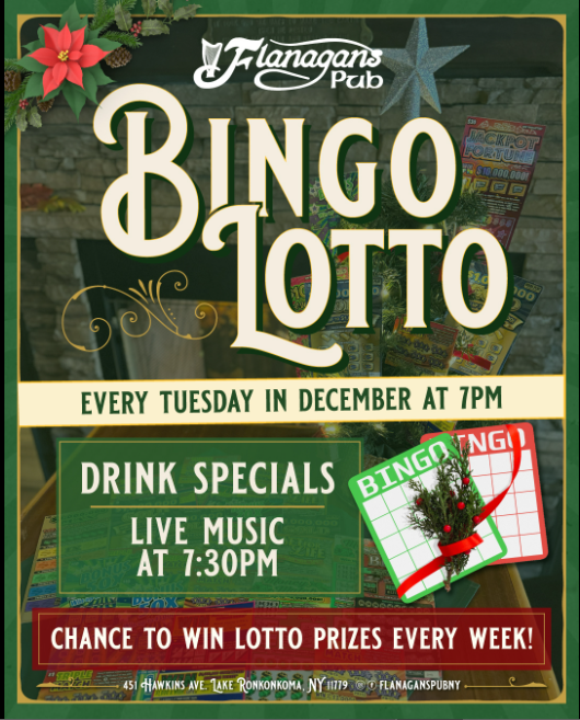 Join us every Tuesday at Flanagan’s Pub for our festive Holiday Bingo Lotto Nights!
