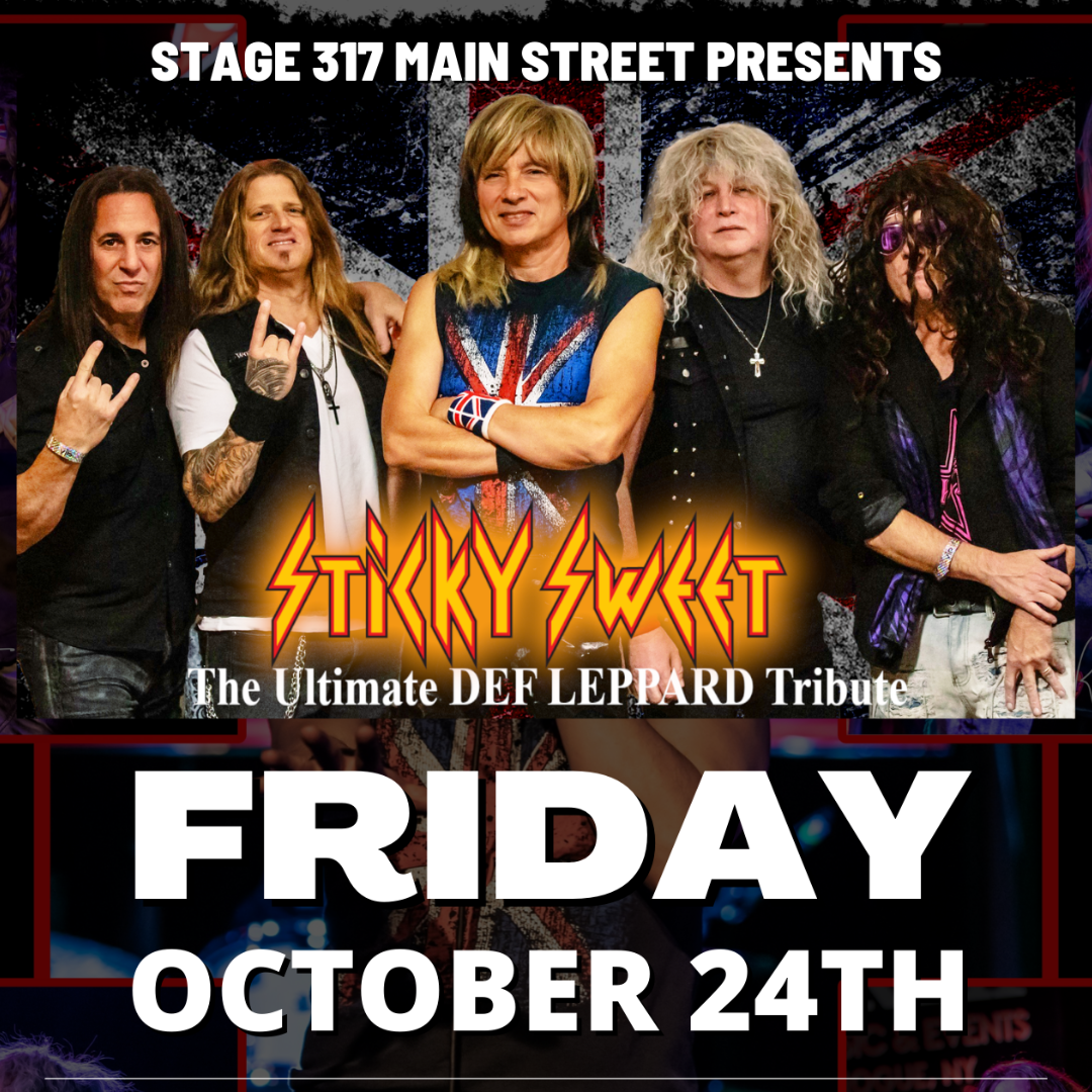 Join 317 Main Street on Friday, October 24th with Sticky Sweet – A Tribute to Def Leppard The sight, the sound, and the attitude of the legendary British Band. Doors open at 8:30 PM | Show begins at 9:00 PM Join 317 Main Street for dinner & drinks beforehand. Make your reservations on OpenTable.com! Please note ALL concerts at Stage 317 are 21+ Starts at 9:00 pm Doors Open at 8:30 pm $15 Online | $20 At the door