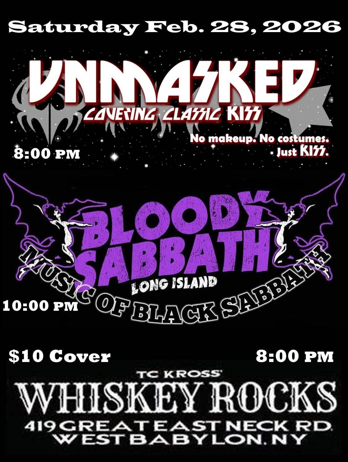 Join Unmasked- The Kiss Cover Band- no make up, no costumes, JUST KISS!! and Bloody Sabbath at Whiskey Rocks