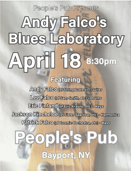 📅 April 18, 2026 ⏰ 8:30 PM 📍 People’s Pub Featuring an all-star lineup: 🎸 Andy Falco (of Stringdusters) 🎹 Eric Finland (of Eric Krasno Band, etc.) 🥁 Lee Falco