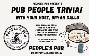 Pub People Trivia is here! May 20 @ 6:30 pm - 9:00 pm People’s Pub 291 Bayport Ave, Bayport, Join us at People’s Pub for a fun and fast-paced night of trivia with your host, Bryan Gallo. Test your knowledge across four exciting rounds of trivia—free to play, with