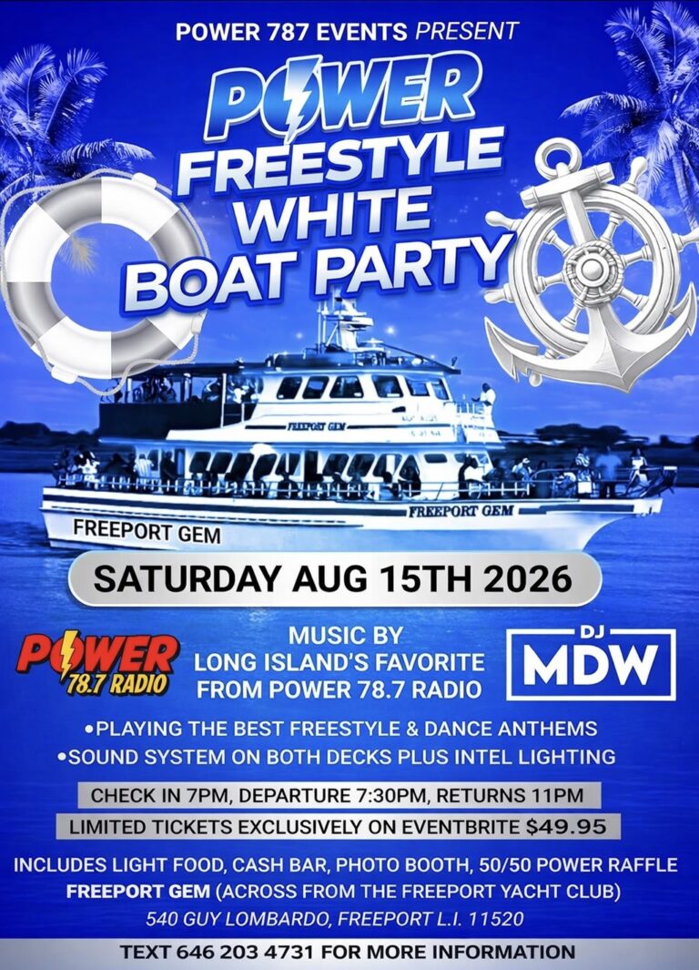 READ MOREFavorite0POWER 787 EVENTS PRESENT POWER WHITE BOAT PARTY! Saturday August 15th 2026 MUSIC BY LONG ISLANDβS FAVORITE DJ MDW FROM POWER 78.7 RADIO. PLAYING THE BEST FREESTYLE & DANCE ANTHEMS