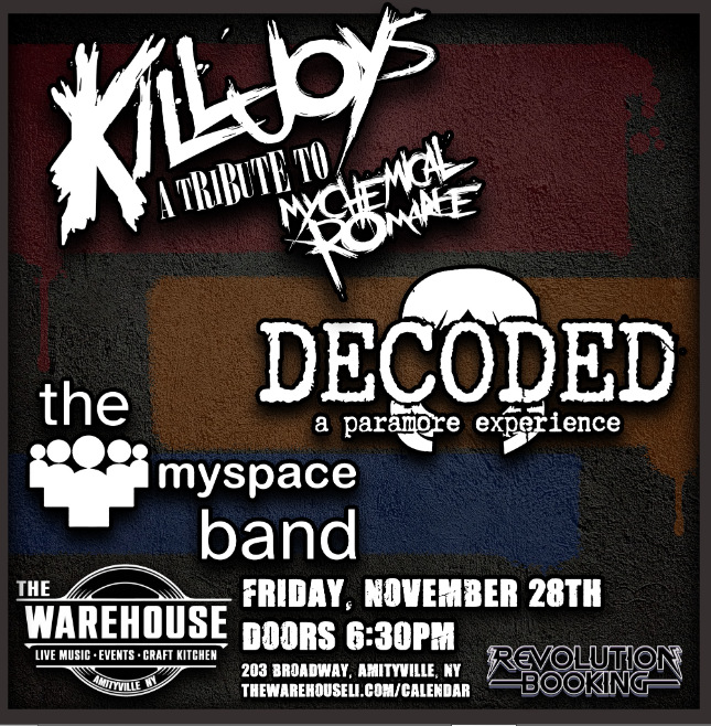 READ MOREFavorite0π Friday, November 28, 2025 π The Warehouse, Amityville, NY π₯ Featuring: πΈ Killjoys β A Tribute to My Chemical Romance π€ Decoded β A Paramore Experience Band π» The