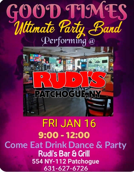 🔥 THE GOOD TIMES BAND 🎸 January 16 @ 9:00 pm - January 17 @ 12:00 am Rudi’s Bar And Grill 554 NY-112, Patchogue 🎉 Dance Party at Rudi’s Bar & Grill! 🎉 📍 Patchogue Get ready to move with the ULTIMATE PARTY BAND ⭐️ THE GOOD TIMES BAND ⭐️ 🗓 January 16 ⏰